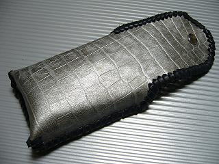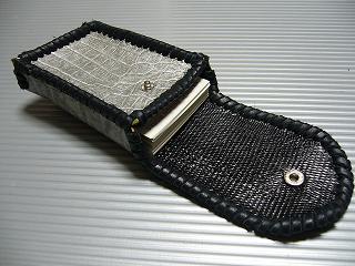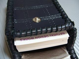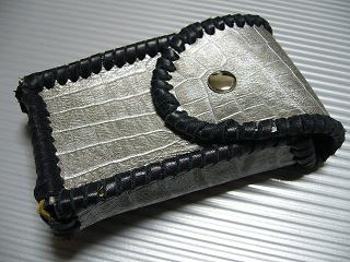| 商品説明 | 名刺サイズのカードケースで、名刺が約100枚入ります。 表面は、クロコ柄の型押しシルバーレザーを使用。 内側は、トカゲ柄型押しのブラックレザーを使用しています。 周囲は、ブラックの革ひもかがりで、仕上げているケースです。 サイズが合えば、名刺サイズのものでしたら、名刺入れ以外の使い方もできます。 例えば、デジカメのケースなど。 蓋は、スナップボタン止めです。 |