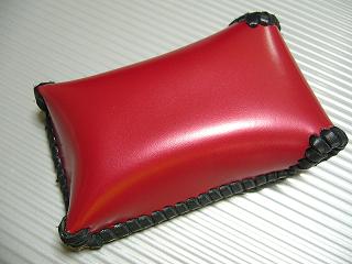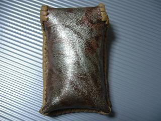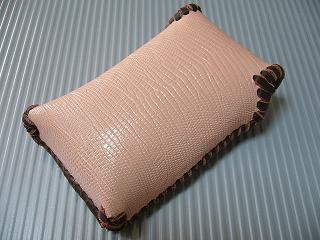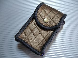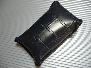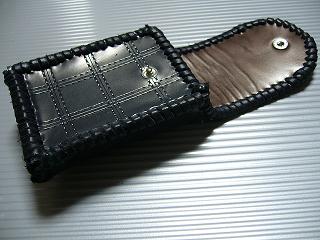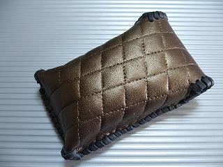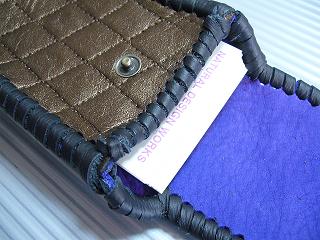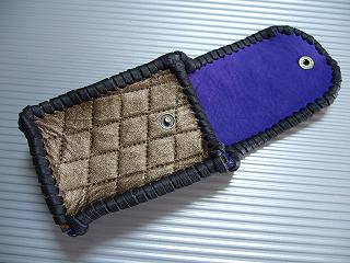 表面は、四角を基本として、縫製したようなデザインの合皮型押しのレザーを使用。 内側は、ブラウンメタリックのレザーを使用しました。 周囲は、ブラックの革ひもかがりです。 使用したレザーの性質上、蓋内側の曲面になる個所は、シワになりやすいです。 |