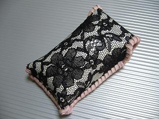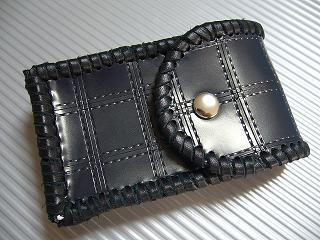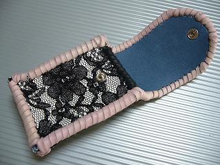 名刺サイズのカードケースで、名刺が約80枚入ります。 表面は、ホワイトレザーの表面に、花柄のブラックレースを貼り付け加工を施してある特殊レザーを使用しています。 内側は、ブルーベリーブルーのレザーで、そうとな感じの柔らかいレザーを使用しています。 周囲は、ローズピンクの淡い色合いのピンクの革ひもでかがっています。 蓋を開けた部分のみ、ブラックの革ひもを使い、アクセント的にかがっています。 |