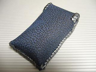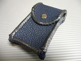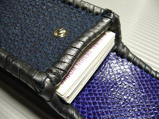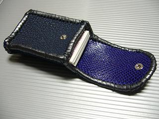 | 商品説明 | 名刺サイズのカードケースで、名刺が約80枚入ります。 表面は、荒い皺感を出したダークブルーのレザーを使用。 内側は、パープルで鱗柄をプリント加工を施してあるレザーを使用しています。 周囲は、グレーメタリックの革ひもかがりで、仕上げているケースです。 |