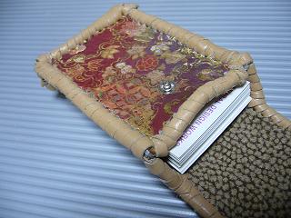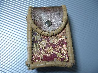 名刺サイズのカードケースで、名刺が約80枚入ります。 表面は、レザーに、着物のような和柄がデザインされたものを使用しています。 蓋を含む後ろの部分は、ブラウンの色をベースに、シルバーカラーをまだらに染めたデザインのレザーを使用しています。 内側は、ベージュのバックスキンに、ブラウンのカラーで、まだらに染めてあるレザーを使用しています。 周囲は、モカの色合いの革ひもで、かがって仕上げています。 |