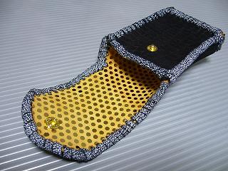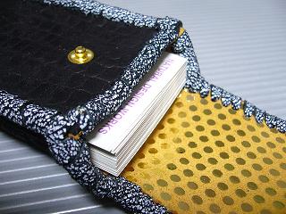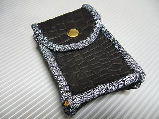 | 商品説明 | 名刺サイズのカードケースで、名刺が約100枚入ります。 表面は、ブラックのスエードレザーに、クロコ柄の型押しをしたレザーを使用。 内側は、イエローカラーの入ったオレンジのバックスキンに、ゴールド水玉をプリント加工したレザーを使用しています。 周囲は、ブラックにホワイトをまだらに配置したデザインのレザーをカットして、革ひもにしてかがりで、仕上げているケースです。 |