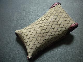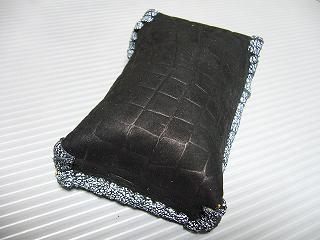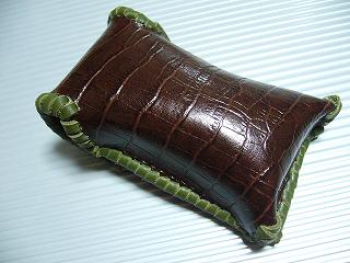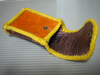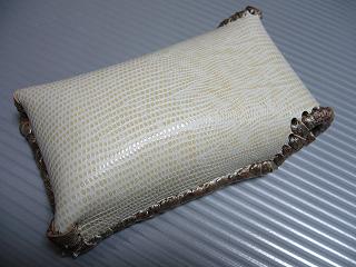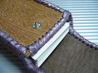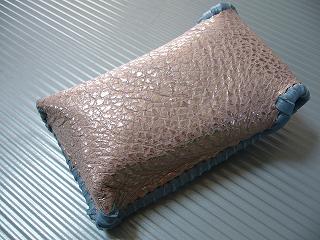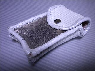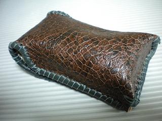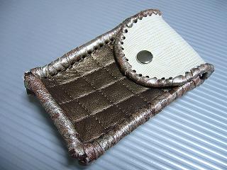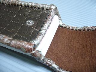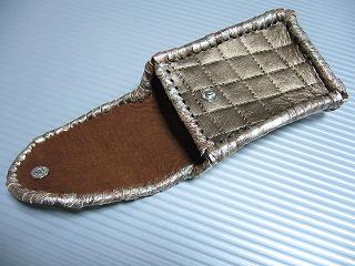 表面の正面側は、クロスステッチを入れたようなデザインの型押しゴールドレザーです。 表面の蓋から後ろ側にかけては、ホワイトトカゲ柄型押しのレザーを使用しました。 内側は、ブラウンのスエードレザーです。 周囲は、ブラウンカラーをベースに、メタリック系のカラーでぼかしたデザインのレザーをカットして、革ひもにしたものをかがって、仕上げています。 |