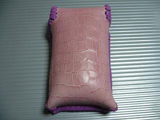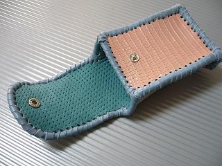 表面は、正面側がクロコ柄型押しのオレンジピンクのレザーを使用しています。 蓋から後側にかけては、アルミカラーのうえに、ピンクの色合いをのせたカラーのレザーを使用しています。 内側は、ソフトな肌触りのペパーミントグリーンパンチングレザーを使用しました。 周囲は、ライトブルーの革ひもで、かがって仕上げています。 |