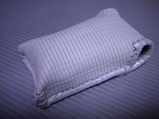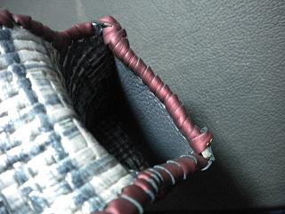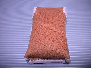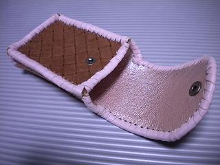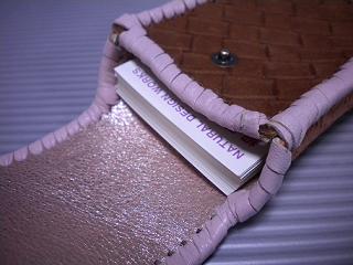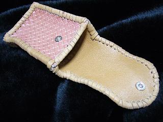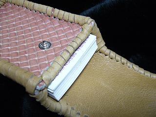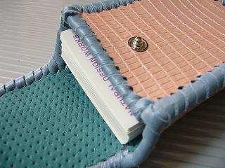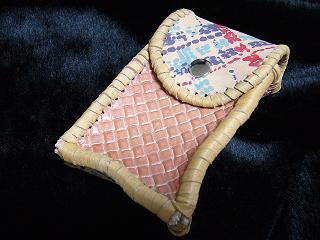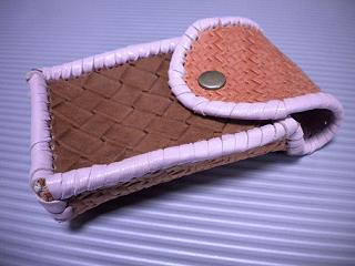 名刺サイズのカードケースで、名刺が約100枚入ります。 表面の正面側は、1センチ幅のレザーを編み込んだような、立体感のあるデザインの型押しライトブラウンレザーを使用しています。 表面の蓋から後ろ側にかけては、籐細工のような編み込みデザインの型押しレザーで、オレンジのカラーが入ったブラウンの色合いのものを使用しました。 内側は、アルミカラーの発色感がある淡いピンクのレザーを使用しています。 ケース周囲は、ローズピンクのレザーで、かがり仕上げをしています。 |