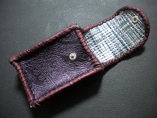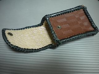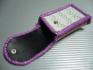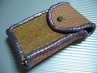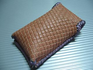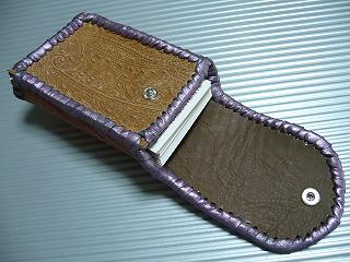 名刺サイズのカードケースで、名刺が約100枚入ります。 表面の正面側は、草木のデザインを素地のレザーに、型押しをしたものを使用しています。 表面の蓋から後ろ側にかけては、縦横編み込みデザインを型押しした赤みのあるオレンジレザーを使用。 内側は、ブラウンレザーを使用しています。 ケースの周囲は、パープルメタリックの革ひもで、かがり仕上げをしています。 |