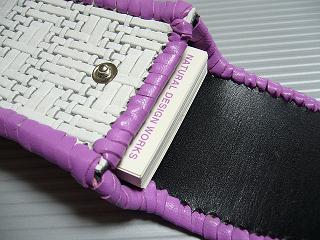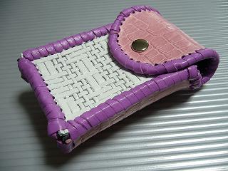 | 商品説明 | 名刺サイズのカードケースで、名刺が約100枚入ります。 表面は表面の正面側は、立体感のある編み込み柄を型押しをしたホワイトレザーを使用。 表面の蓋及び後ろ側は、クロコ柄型押しのピンクレザーを使用しています。 内側は、ブラックレザーを使用しました。 ケースの周囲は、パープルレザーで、かがり仕上げをしています。 |