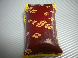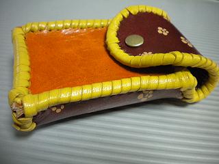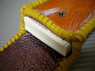 名刺サイズのカードケースで、名刺が約80枚入ります。 表面の正面側は、オレンジのカラーに、ブラウンカラーを入れてぼかしたカラーのレザーを使用しています。表面の蓋から、後ろ側にかけては、素地のレザーに、花柄を残してワインレッドで染め加工を施した、レザーを使用しています。 ケース内側は、アルミカラーのレッドレザーを使用しました。 ケース周囲は、濃いめのイエローレザーで、かがり仕上げをしています。 |