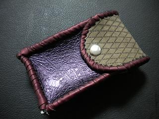 名刺サイズのカードケースで、名刺が約100枚入ります。 表面の正面側は、ペイズリー柄型押しのパープルメタリックレザーを使用。 表面の蓋から後ろ側にかけては、ブラウンのスエードレザーに、凸のドットプリント加工を施したものを使用しました。 ケース内側の正面側は、グレーメタリックレザーを使用。 内側の蓋から、後ろ側にかけては、立体感のある編み込み型押しに、ブルーグレーカラーで、チェック柄を施したデザインのものを使用しています。 ケース周囲は、グレープメタリックレザーで、かがり仕上げをしました。 |
