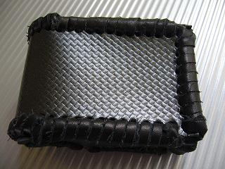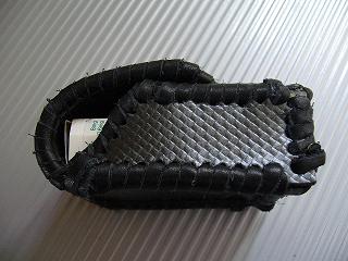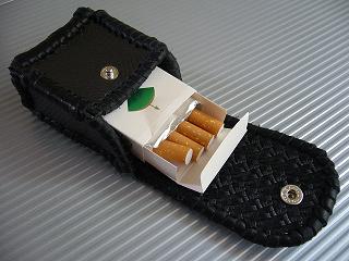 ショートホープ専用サイズで製作しました。 チェックの型押しレザーに、ブラックメタリックの加工を施したレザーを表面に使い、周囲をブラックの革ひもでかがって仕上げています。 内側のレザーは、籐細工のようなクロス編みこみ柄の型押しで、立体感のあるデザインのブラックレザーを使いました。 ブラックで統一していても、表面や色で変化を出し、スナップボタンにクロム感を出すことで、品のあるワイルドさを出してみた仕様です。 *タバコは、イメージですので、付属しません。 |