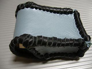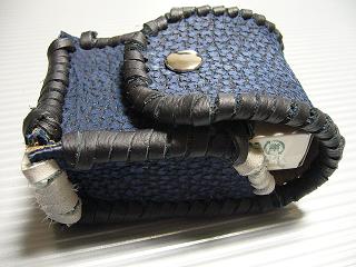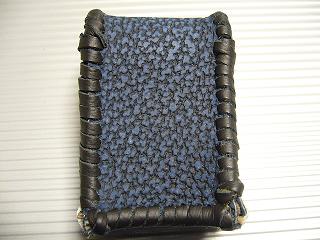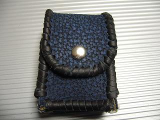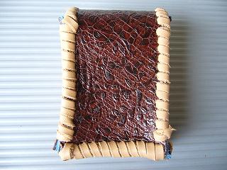 表面は、皺の感じを粗くデザイン加工を施したダークブルーのレザーを使用しています。 内側は、ベージュのパンチングレザー(穴貫通)を使用しています。 周囲は、ブラックとホワイトの革ひもで、かがって仕上げています。 革ひもの配置は、側面の横ラインのみ、ホワイトをアクセントで使用し、他は、ブラックとしています。 *タバコは、イメージですので、付属しません。 |