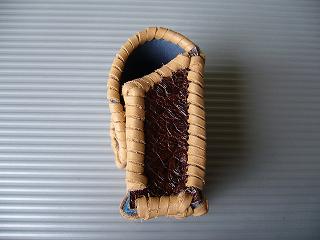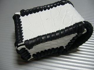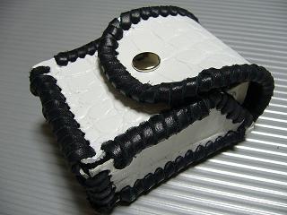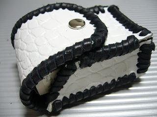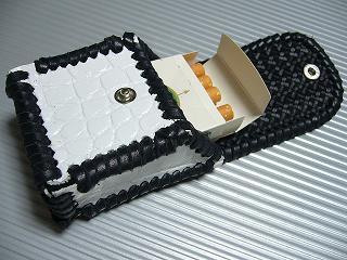 ショートホープ専用サイズで製作しました。 クロコ柄の型押しをしたスーパーホワイトのレザーを表面に使用。 周囲をブラックの革ひもで、かがって仕上げています。 内側は、籐細工のような編み込み柄で、立体感のあるデザイン柄の型押しがあるブラックレザーを使用しています。 蓋は、スナップボタン止めです。 小ぶりで、スポーティーな感じで仕上げてみました。 *タバコは、イメージですので、付属しません。 |