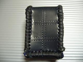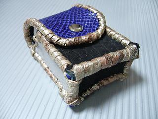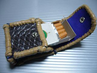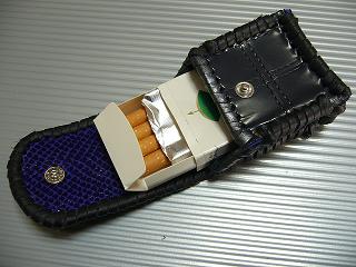 ショートホープ専用サイズで製作しました。 表面は、ダークブルーの合皮で、四角をモチーフにステッチが入ったデザインの型押しを使用しています。 内側は、パープルレザー表面に、鱗柄のプリント加工が施してあるレザーを使用しています。 周囲は、ブラックの革ひもで、かがって仕上げています。 蓋を開けた際のふちの部分のみ、グレーメタリックの革ひもで、かがってアクセントとしてます。 蓋は、スナップボタン止めです。 *タバコは、イメージですので、付属しません。 |