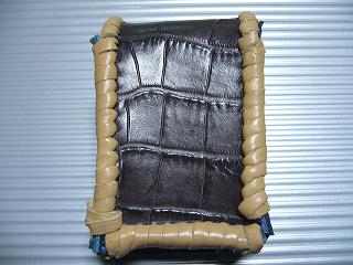 ショートホープ専用サイズで製作しました。 表面の正面と底は、ブラックスエードに、クロコ柄を型押しをしたレザーを使用しています。 表面の両側面は、ライトグレーのレザーを使用。 蓋から後ろ側にかけては、パープルレザー表面に、鱗の柄をプリント加工を施してあるレザーを使用しています。 内側の正面側と背の部分は、ブラックレザーを使用しています。 内側の左右側面は、パープルのスエードレザーを使用しています。 底の部分は、ブルーベリーブルーのスエードレザーを使用しています。 周囲は、ブラウンをベースに、表面をシルバーでぼかしてまだらに加工をしたレザーをカットして、革ひもにしたものをかがって、仕上げています。 *タバコは、イメージですので、付属しません。 |