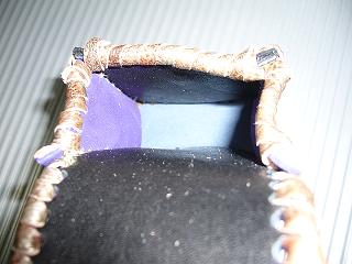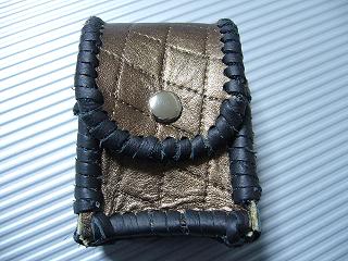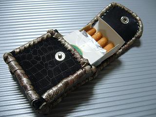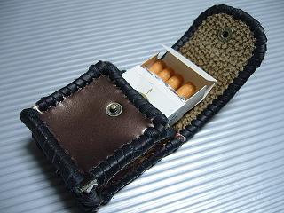 ショートホープ専用サイズで製作しました。 表面のサイドを除いた部分は、カッパーゴールドで、クロスステッチが入ったようなデザインを型押しをしたレザーを使用しています。 表面側のサイド部分は、紫に茶系が入ったクロコ柄型押しのレザーを使用しています。 内側は、ベージュのバックスキンの表面に、ブラウンのカラーで、まだら模様に、染めたレザーを使用しています。 周囲は、ブラックの革ひもで、かがって仕上げています。 蓋を開けた際のふちの部分のみ、黒みのあるゴールドカラーを用いています。 蓋は、スナップボタン止めです。 *タバコは、イメージですので、付属しません。 |