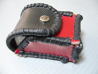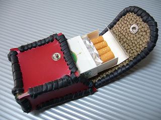 ショートホープ専用サイズで製作しました。 表面は、蓋を開けた正面およびサイドが、パール発色のあるレッドのレザーを使用しています。 後ろ側と底の部分が、チェック柄の型押しをしたブラックメタリックのレザーを使用しています。 内側は、ベージュのバックスキンに、ブラウンのまだら模様を染めたレザーを使用しています。 サイドと底の部分は、ベージュのパンチングレザー(穴貫通)を使用しています。 周囲は、ブラックの革ひもかがりで、仕上げています。 蓋は、スナップボタン止めです。 *タバコは、イメージですので、付属しません。 |