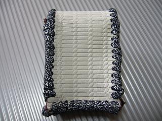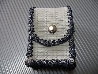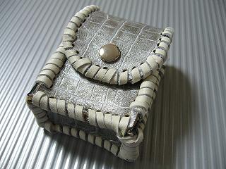 ショートホープ専用サイズで製作しました。 表面は、横ラインを基調とした溝のあるデザインのホワイトレザーを使用しています。 内側は、つたのような柄で凹凸感のあるデザインを型押しをしたレザーです。 つたのがらは、ワインレッドの色合いで、凸になっていて、周囲は、凹で細かいクロスのようなデザインで、ブラックカラーがのせてあります。 周囲は、ブラックに、ホワイトのカラーがまだらに、デザインされたレザーを革ひもにして、かがりで仕上げています。 蓋は、スナップボタン止めです。 *タバコは、イメージですので、付属しません。 |