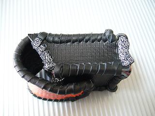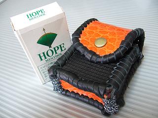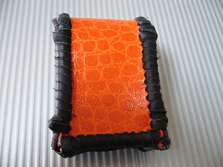 | 商品説明 | ショートホープ専用サイズで製作しました。 表面の蓋部分から後ろにかけて、底の部分は、クロコ柄型押しのオレンジカラーのレザーを使用しています。正面と左右側面は、細かい線状クロス柄のブラックレザーを使用しています。 内側は、ツタのような柄型押しのレザーで、ツタの部分がワインレッド、周囲は、ブラックでぼかし染めしてあります。このぼかし染の部分は、細かいクロス状デザインの型押しになっています。 周囲は、ブラックの革ひもをメインでかがり、左右側面と蓋を開けたふちの部分のみ、ブラックにホワイトをまだらに配置したデザインのレザーを革ひもにしたもので、かがってアクセントをつけています。 蓋は、スナップボタン止めで、光沢感を抑えたブロンズ色を使用しています。 *タバコは、イメージですので、付属しません。 |
