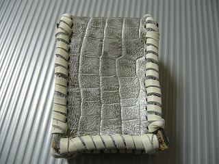 ショートホープ専用サイズで製作しました。 表面の左右側面を除いた部分は、クロコ柄型押しのシルバーレザーを使用しています。 左右側面は、ブラウンメタリックのレザーを使用しました。 内側は、ベージュのバックスキンに、ブラウンのカラーで、まだらに染めた加工が施されているレザーを使用しています。 周囲は、ホワイトの革ひもで、かがって仕上げています。 蓋は、スナップボタン止めで、光沢感のあるクロムを使用しています。 *タバコは、イメージですので、付属しません。 |