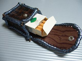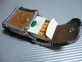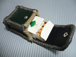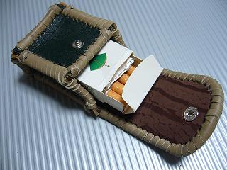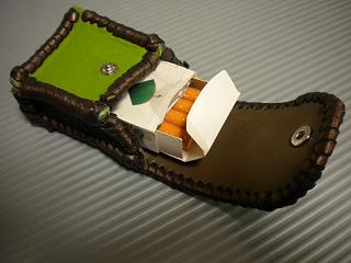 ショートホープ専用サイズで製作しました。 表面は、深みのあるグリーンのレザーを使用しています。 内側は、ウッドの木目柄のようなデザインのレザーを使用。 ケース周囲は、コーヒーブラウンの革ひもで、かがり仕上げをしています。 *タバコは、イメージですので、付属しません。 |