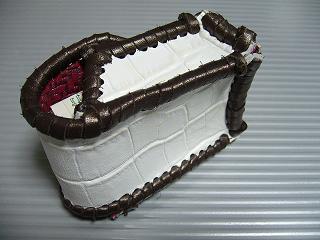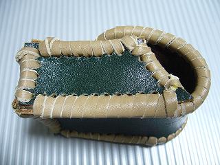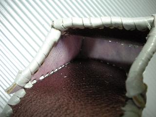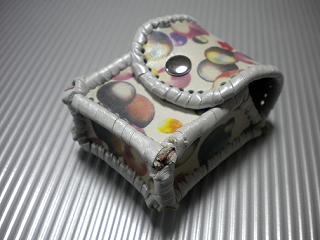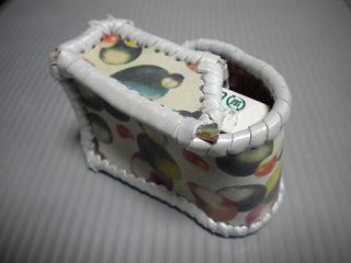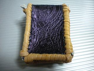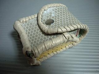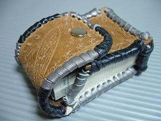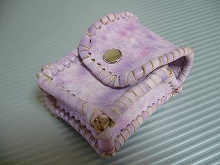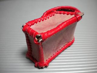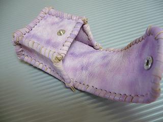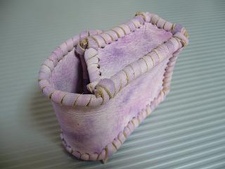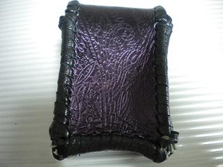 表面の正面と底の部分は、サークルデザインを型押したグレープメタリックレザーを使用。 表面の両側面は、ホワイトレザーを使用しました。 表面の蓋から、後ろ側にかけては、ペイズリーデザインを型押したパープルメタリックレザーを使用。 ケース内側は、ピンクメタリックレザーを使用。 ケース周囲は、ホイートのレザーで、かがり仕上げをしています。 |