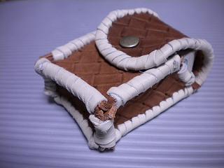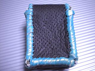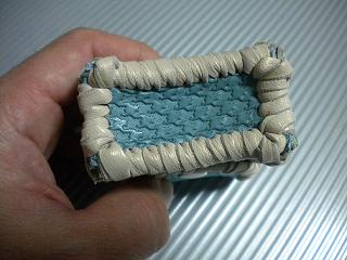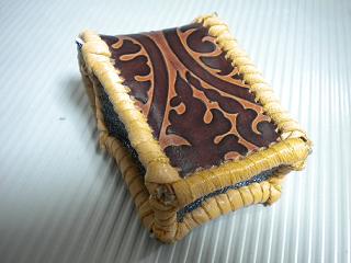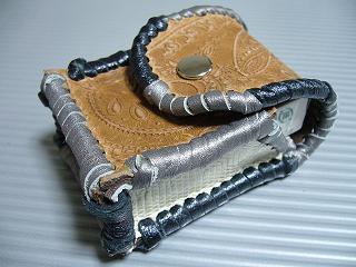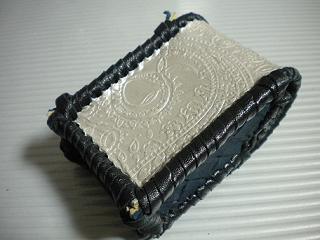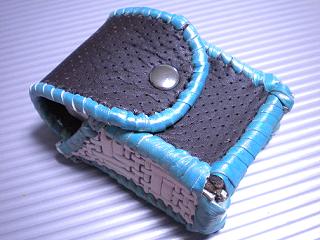 表面の正面側と蓋から、後ろ側にかけては、ブラウンパンチングレザー(穴貫通)を使用しています。 表面の両側面と底の部分は、編み込みデザインを型押しをした、ホワイトレザーを使用しています。 内側は、アッシュブラウンのレザーを使用しています。 ケース周囲は、トロピカルブルーのカラーに、シャボン玉の油膜ようなカラーをのせた色合いのレザーで、かがり仕上げをしました。 *タバコは、イメージですので、付属しません。 |