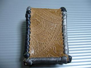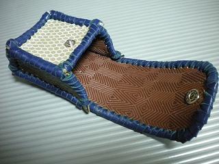表面の正面と蓋から後ろ側にかけては、ウエスタンリーフデザインの型押しレザーを使用しています。 表面の両サイドと底の部分は、デニムのようなカラーデザインのレザーを使用しました。 デニムみたいですが、角度によってキラキラとラメのような光沢感のあるものです。 ケース内側は、タンカラーのレザーを使用。 ケース周囲は、ホイートのレザーで、かがり仕上げをしました。 |