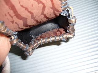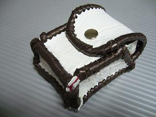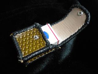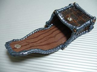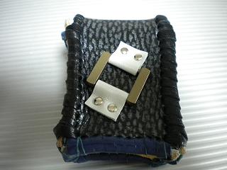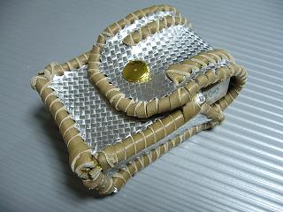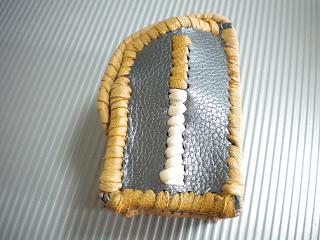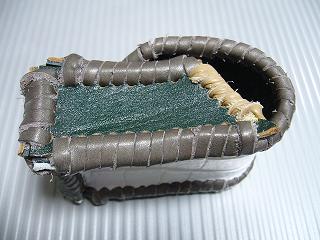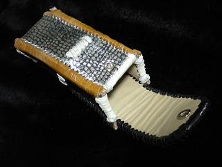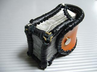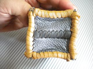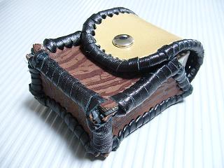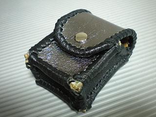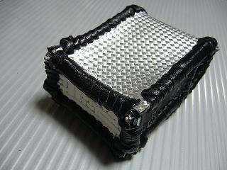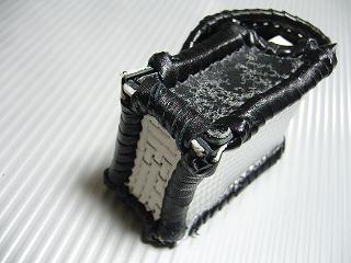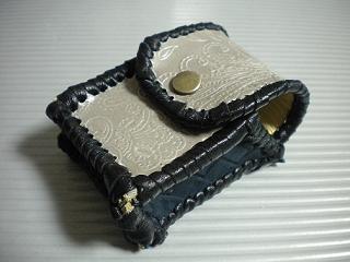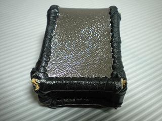 表面の正面側と蓋から、後ろ側になけては、メタルシルバーのレザーを使用。 表面の両側面、底の部分は、スニーカーの靴底のような、幾何学的デザインを型押した、ブラックレザーを使用しました。 ケース内側は、キャメルブラウンのレザーを使用。 ケース周囲の部分は、ブラックレザーで、かがり仕上げをしました。 |