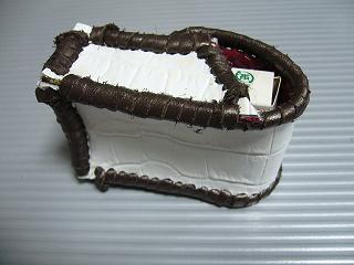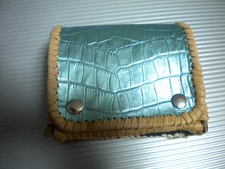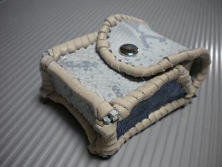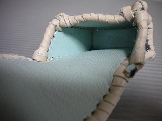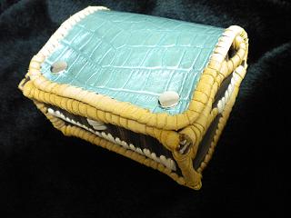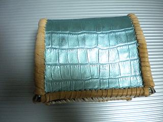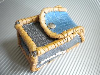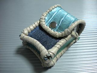| 商品説明 | 表面の正面側は、デニム生地のデザインを表現したレザーを使用。 表面の蓋から、後ろ側にかけては、クロコ柄型押しのブルーメタリックレザーを使用しています。 表面の両側面は、ミントグリーンレザーを使用。 表面の底の部分は、ハウンドトゥース柄を型押した、ミントブルーのレザーを使用しています。 ケース内側は、ブロンズメタリックレザーを使用しました。 ケース周囲は、パールアイボリーレザーで、かがり仕上げをしました。 |