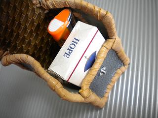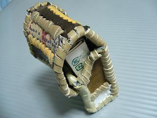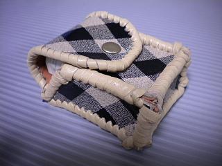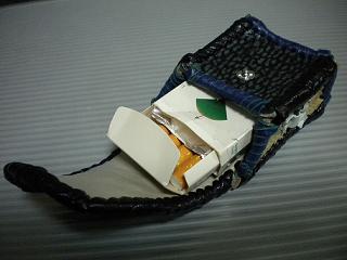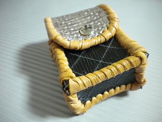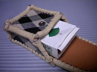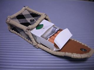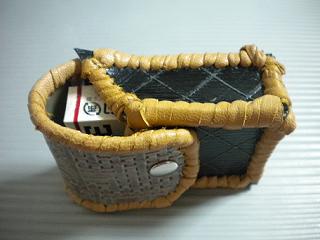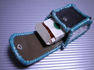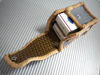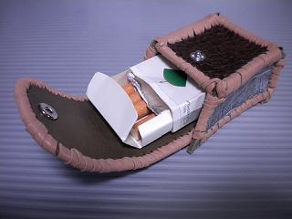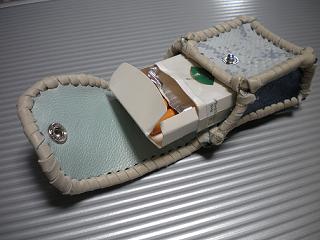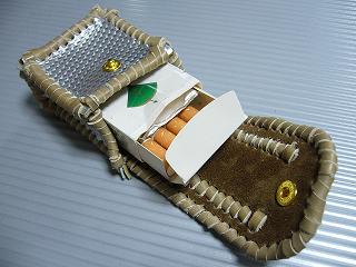 | 商品説明 | ショートホープ専用のシガレットケースです。 ショートホープを2個収納することができます。 100円ライターを立てて入れられるサイズにしてあるので、ショートホープ1個と100円ライターという使い方もできます。 サイズは、6センチ×6センチ×11センチ(縦×横×高さ)。 ケース表面の正面、と両側面は、グレーメタリックレザーを使用。 蓋から、後ろ側にかけては、クロコ柄型押しのブルーレザーを使用しました。 ケース内側は、中の仕切りと両側面は、ブロンズメタリックレザーを使用。 正面側、底、蓋から後ろ側にかけては、渋茶カラーの編み込みデザイン型押しレザーを使用しています。 ケース周囲は、ホイート、パールアイボリー、ライトグレーのレザーで、かがり仕上げをしました。 |