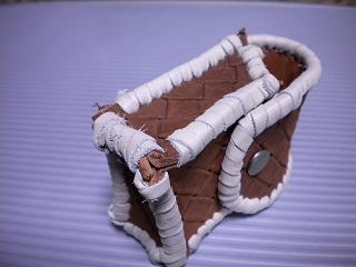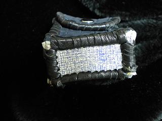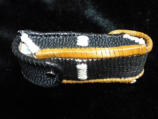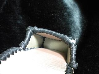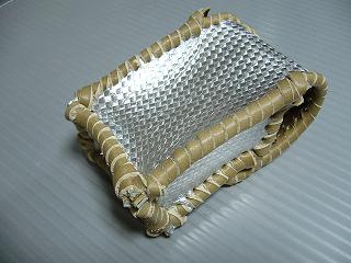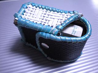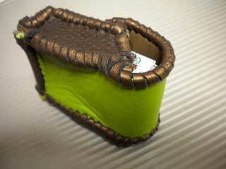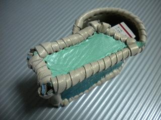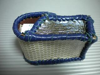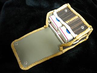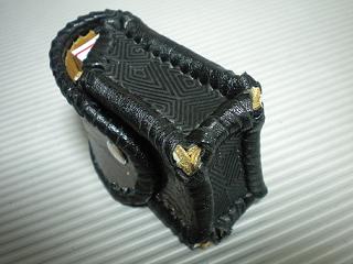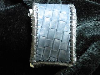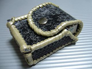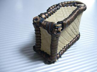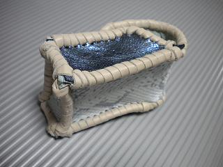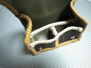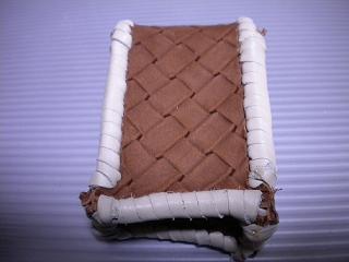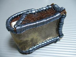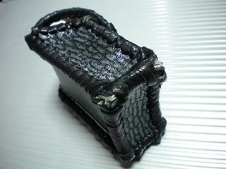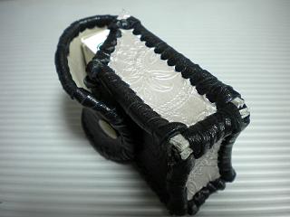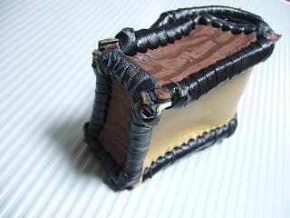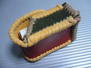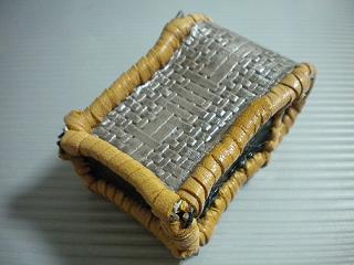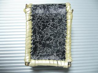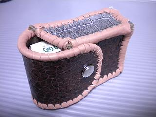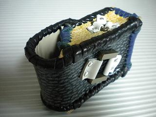 表面の正面、両側面、底の部分は、ブラックベースに、クロスラインを型押したデザインのレザーを使用。 表面の蓋から、後ろ側にかけては、編み込みデザインを型押した、メタリックローズブラウンレザーを使用。 ケース内側は、ブロンズメタリックレザーを使用しました。 ケース周囲は、ホイートのレザーで、かがり仕上げをしています。 |