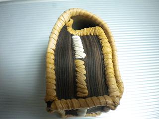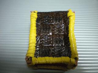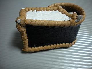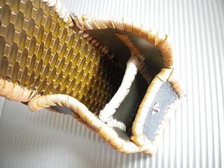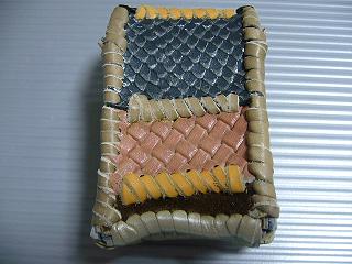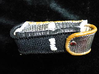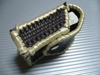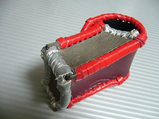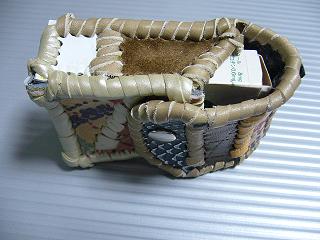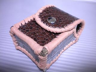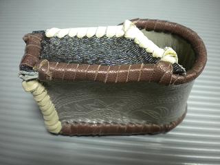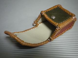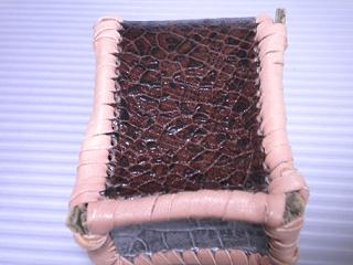 表面の正面側、両側面、底の部分は、編み込みデザインを型押した、渋茶カラーのレザーを使用しています。 表面の蓋から後ろ側にかけては、編み込みデザイン型押しのメタリックローズブラウンレザーを使用。 ケース内側の両側面、底の部分は、ブロンズブラウンレザーを使用。 ケース内側の正面側、蓋から後ろ側にかけては、ピンクメタリックレザーを使用。 ケース周囲は、ブラックレザーを使用して、かがり仕上げをしています。、 |