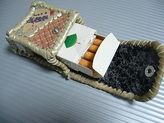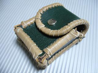 | 商品説明 | 表面の正面側と蓋から後ろ側は、グリーンレザーを使用しています。 表面の両側面、底の部分は、ブラウンパンチング(穴貫通)を使用しました。 内側は、アッシュブラウンのレザーを使用。 ケース周囲は、ゴールドレザーで、かがりをして、仕上げています。 *タバコは、イメージですので、付属しません。 |