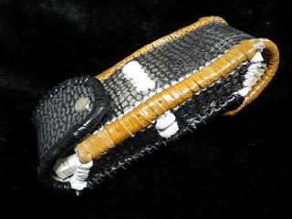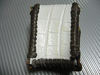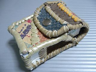 ショートホープ専用サイズのシガレットケースです。 表面のみ、レザーをパッチワーク調に、かがりでつないだものを使用しています。 表面の正面側は、縦横の編み込み柄型押しで、赤みのあるオレンジレザーとレザーに、線状でペイントしたようなデザインのレザーを斜めにカットして、シャンパンゴールドの革ひもでかがってつなげています。 表面の左右側面は、クロコ柄型押しのホワイトレザーとブラウンのスエードレザーを横ラインでカットして、カーキの革ひもで、かがってつないでいます。 表面の底部分は、クロコ柄型押しのホワイトレザーと線状でペイントしたようなデザインのレザーをシャンパンゴールドの革ひもで、かがってつないでします。 表面の蓋から後ろ側にかけては、鱗の柄を型押しをしたダークブルーのレザー、ステッチを入れたような型押しのゴールドレザー、ペイントしたようなデザインのレザー、赤みのあるオレンジレザーとレザーに、線状でペイントしたようなデザインのレザー、ブラウンスエードレザーをカーキの革ひもとイエローの入ったオレンジカラーの革ひもで、かがってつなぎました。 ケース内側はブラックレザーで、擦れた様な感じをデザインしたレザーを使用しています。 ケース周囲は、シャンパンゴールドとカーキの革ひもで、かがり仕上げをしています。 |