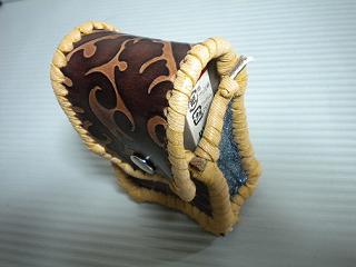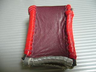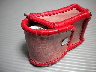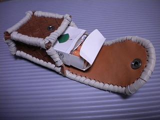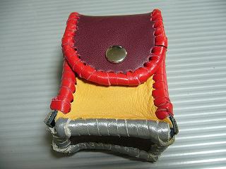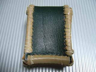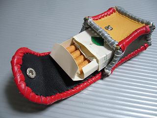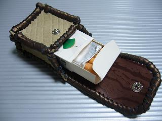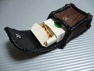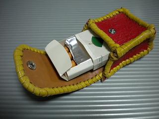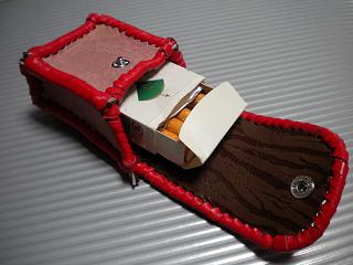ショートホープ専用サイズで製作しました。 表面の正面側、底、左右側面は、ダークグリーンのレザーを使用しました。 表面の蓋から後ろ側にかけては、レッドレザーを使用しています。 ケースの内側は、オレンジがかったブラウン系のレザーを使用。 ケースの周囲は、革ひものかがり仕上げです。 横ラインと縦ラインで、違うカラーの革ひもをしようしています。 縦は、内側に使用したレザーと同じもの、横ラインは、コーヒーブラウンのレザーを使用しました。 *タバコは、イメージですので、付属しません。 |
