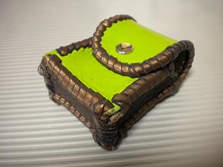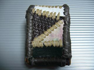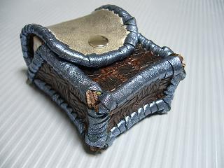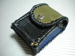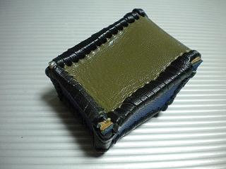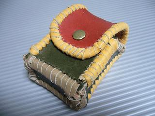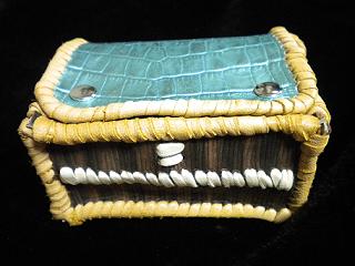 | 商品説明 | 表面の正面側は、幅広のチェックデザインを型押した、ブラックレザーを使用。 表面の蓋から、後ろ側にかけては、ダークグリーンレザーを使用しています。 表面の両側面と底の部分は、シボが粗めのデザインのブルーレザーを使用しています。 ケース内側は、キャメルブラウンのレザーを使用。 ケース周囲の部分は、ブラックレザーで、かがり仕上げをしました。 |