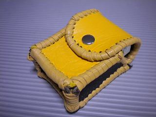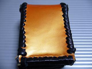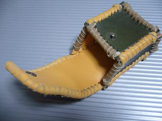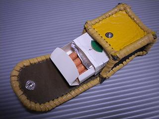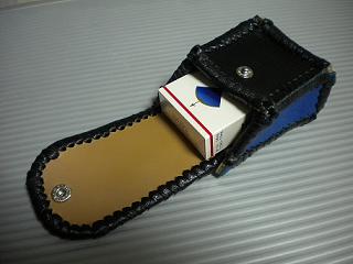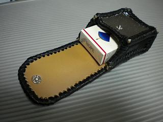 ショートホープ専用サイズで製作しました。 表面の正面側と蓋から後ろ側にかけては、イエローレザーを使用。 表面の左右側面と底の部分は、ブラウンパンチングレザーを使用しました。 内側は、アッシュブラウンのレザーを使用。 ケース周囲は、濃いめのイエローのレザーで、かがりをして、仕上げています。 *タバコは、イメージですので、付属しません。 |