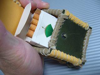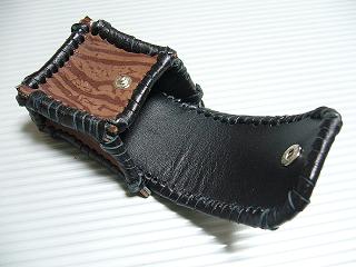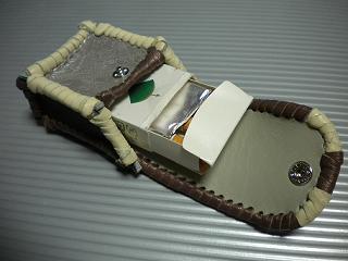 ショートホープ専用サイズで製作しました。 表面の正面側、左右側面、底の部分は、ウッドの木目の柄をデザインしたブラウンレザーを使用しています。 表面の蓋から後ろ側にかけては、ベージュレザーを使用しています。 内側は、ブラックレザーを使用。 ケース周囲は、ブラックの革ひもで、かがり仕上げをしています。 *タバコは、イメージですので、付属しません。 |