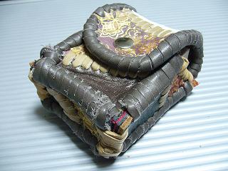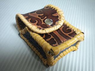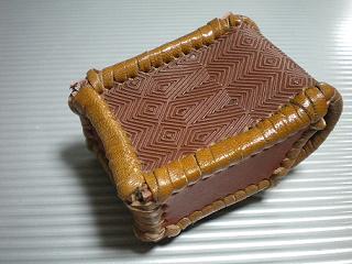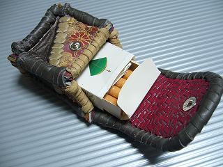 | 商品説明 | 表面の正面側、両側面、底の部分は、草木のデザインを型押しをした、レッドレザーを使用しています。 表面の蓋から、後ろ側にかけては、ニス仕上げ籐細工のような立体感のある型押し、ブラウンレザーを使用しています。 内側は、キャラメルブラウンのレザーを使用。 ケース周囲は、濃いめのイエローレザーで、かがり仕上げをしています。 *タバコは、イメージですので、付属しません。 |