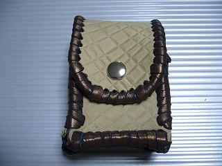ショートホープ専用サイズで製作しました。 表面は、細かい四角をモチーフに、チェック柄をデザインした型押しのシルバーレザーを使用しました。 内側は、ブラウンのスエードレザーを使用。 ケース周囲は、ベージュのレザーで、かがりを行い、仕上げています。 蓋の部分には、かかり穴を開けて、周囲のかがりと同じレザーで、かがり装飾を付けてみました。 スナップボタンは、ゴールドカラーのものを使用しています。 *タバコは、イメージですので、付属しません。 |