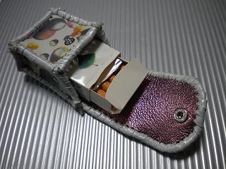 表面の正面側と蓋から後ろ側にかけては、草木のデザインを型押しをした、パープルメタリックのレザーを使用しています。 表面の両側面、底の部分は、草木のデザインを型押しをした、パールグレーのレザーを使用しました。 内側は、ホワイトグレーのレザーを使用しています。 ケース周囲は、ブラックレザーで、かがりをして、仕上げています。 *タバコは、イメージですので、付属しません。 |