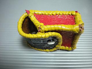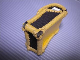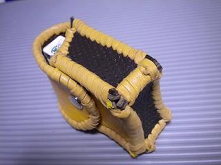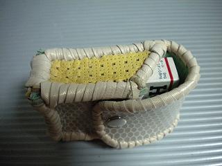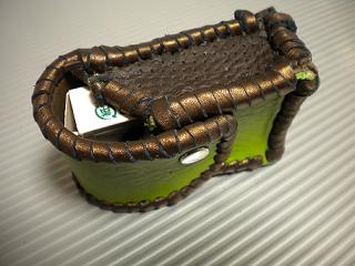 表面の正面と蓋から後ろ側にかけては、六角形をモチーフにしたデザインを型押したレザーを使用しています。 六角形は、ホワイトの縁取りで、中が薄めのゴ―ルドカラーに、なっています。 表面の両側面、底の部分は、イエローレザーに、大、小の四角穴を使ったデザインをパンチング加工した、レザーを使用しています。 ケース内側は、ミントグリーンレザーを使用。 ケース周囲は、パールアイボリーレザーで、かがり仕上げをしています。 |