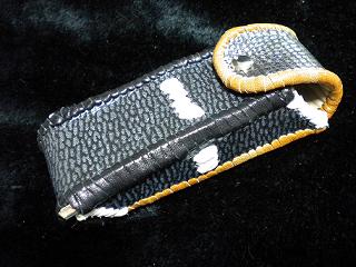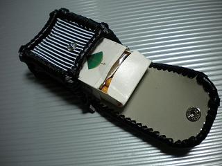 ケース表面の正面と蓋から後ろ側にかけては、ブラックベースに、グレーメタリックの斑点デザインのレザーを使用しています。 表面の両側面と底の部分は、和紙のようなデザインのイエローレザーを使用しました。 ケース内側は、アイボリーのレザーを使用しています。 ケース周囲は、ブルーレザーとブラックレザーを使用し、かがり仕上げをしています。 横ラインがブルー、縦ラインがブラックのカラー配置になっています。 ケース表面には、金属パーツをパールホワイトのレザーに通し、固定をして装飾しています。 蓋の部分と後ろ側は、角型のパーツ。 両側面は、三角かんを使っています。 *タバコは、イメージですので、付属しません。 |
