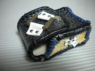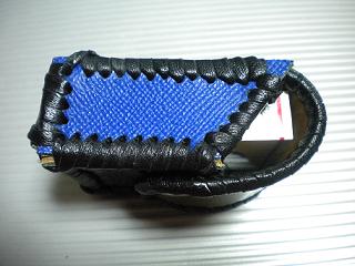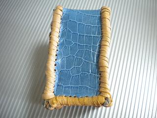 表面の正面側と蓋から、後ろ側にかけては、幅広の編み込みデザインを型押した、ダークブルーレザーを使用しています。 表面の両側面と底の部分は、ブルーカラーで、デジタルノイズデザインを表現した、レザーを使用しています。 ブルーの部分は、角度によって、発色感があります。 ケース内側は、ホワイトグレーレザーを使用しました。 ケース周囲の部分は、ブラックレザーで、かがり仕上げをしています。 |