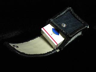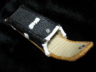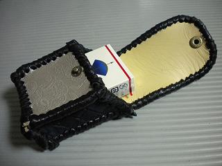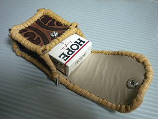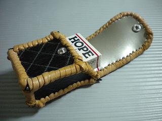ショートホープ専用サイズで製作しました。 表面は、クロスデザインの彫り込みを型押しをした、ベージュのソフトレザーを使用しています。 内側は、左右側面と底の部分がブラックレザーを使用。 内側の前側と後ろ側が、ウッドの木目をデザインした、ブラウンレザーを使用しています。 ケース周囲は、ゴールドレザーで、かがり仕上げをしています。 *タバコは、イメージですので、付属しません。 |
