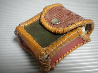 表面の正面側は、染色のグリーンレザーを使用。 表面の両側面と底の部分は、染色のレッドレザーを使用。 表面の蓋から、後ろ側にかけては、スニーカーのラバーのような、幾何学的デザインを型押しをした、ブラウンレザーを使用しました。 内側は、ライトグレーのレザーを使用。 ケース周囲は、ライトブラウンレザーで、かがり仕上げをしています。 *タバコは、イメージですので、付属しません。 |