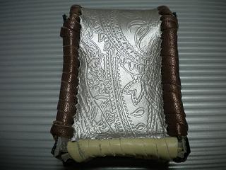 | 商品説明 | 表面の正面側と蓋から、後ろ側は、ペイズリーデザイン型押しのパールグレーレザーを使用しています。 表面の両側面は、幅広の編み込みデザイン型押しのダークブルーレザーを使用。 表面の底部分は、ブロンズブラウンレザーを使用しました。 ケース内側は、クリームレザーを使用しています。 ケース周囲は、ブラックレザーで、かがり仕上げをしています。 |