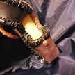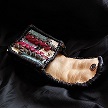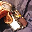 寸法は、タバコ収納部、高さ11.5センチ、縦3.5センチ、横7センチです。 ライター収納部分、高さ9センチ、 縦3.5センチ、横2.5センチです。 収納できるタバコサイズは、レギュラーサイズのみで、ロングは、対応しません。 「ケース本体」 表面の正面側は、クロコ柄型押しのホワイトレザーを使用。 表面の蓋から後ろ側にかけては、細かい草木の柄を型押したブラウンレザーを使用。 表面の左側面と底の部分は、濃いパープルスエードレザーを使用。 表面の右側面は、ライトゴールデンドッドイエローレザーを使用。 内側の正面と背面は、光沢のあるブラックレザーを使用。 内側の左側面と底の部分は、ライトゴールデンドッドイエローレザーを使用。 内側の右側面は、濃いパープルスエードレザーを使用。 「ライター収納部」 蓋の部分、表面は、クロコ柄型押しのホワイトレザーを使用。 蓋の内側は、光沢を押さえたブラックレザーを使用。 ライター収納部表面は、濃いパープルスエードレザーを使用。 ライター収納部内側は、光沢のあるブラックレザーを使用。 ケース周囲のかがりは、ブラックレザーとライトブラウンレザーを使用して仕上げています。 *タバコは、イメージですので、付属しません。 |