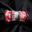 寸法は、タバコ収納部、高さ11.5センチ、縦3.5センチ、横7センチです。 ライター収納部分、高さ9センチ、 縦3.5センチ、横2.5センチです。 収納できるタバコサイズは、レギュラーサイズのみで、ロングは、対応しません。 「ケース本体」 ケース正面側、両側面の表面は、カットしたレザーをレザーで、かがりをしたパッチワーク調にしています。 表面の正面側は、シャボンの油膜のような、デザインレザーとレッドメタリックのボカシデザインレザーの2種類を使っています。 2つのレザーのつなぎは、ピンクレザーを使用。 表面の両側面は、シャボンの油膜のようなデザインレザー、ピンクレザー、樹皮のようなデザインの3種類のレザーを使いました。 3つのパーツのつなぎは、ブラウンとライトブラウンレザーを使用。 表面の蓋から後ろ側にかけては、メッシュデザインを型押したレッドメタリックレザーを使用。 表面の底の部分は、シャボンの油膜のようなデザインレザーを使用。 ケース内側は、蓋から後ろ側にかけては、花柄レース生地のようなデザインをベージュレザーに、型押しをしたものを使っています。 それ以外の所は、ロジーブラウンレザーを使用しています。 「ライター収納部分」 蓋の部分は、カットしたレザーをレザーでかがり、つなげたパッチワーク調です。 ポケット部分の表面は、花柄レース生地のようなデザインをベージュレザーに、型押しをしたものを使っています。 ポケット内側は、シャボンの油膜のようなデザインレザーを使用。 蓋の部分は、花柄レース生地のようなデザインをベージュレザーとシャボンの油膜のようなデザインレザーを使用、表面と内側を交互に配置しています。 つなぎのレザーは、ホワイトレザーとライトブラウンレザーを使用。 ケース周囲のかがりは、ワインレッドレザーを使い、かがり仕上げをしています。 *タバコは、イメージですので、付属しません。 |