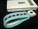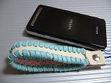 白のクロコ型押しレザーに、スカイブルーの革ひもかがり。内側と両端部は、ピンクの型押しレザー。取り付けひもは、ブルー。 *携帯電話は、参考で付属しません。 |
